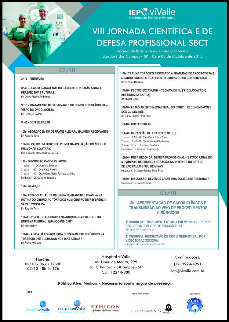 A Sociedade Brasileira de Cirurgia Torácica convida para o VIII Jornada Científica e de Defesa Profissional SBCT em São José dos Campos – SP nos dias 02 e 03 Outubro de 2015.